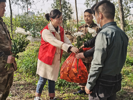 扫墓活动结束以后,全体志愿者们在墓地入口处开展了“鲜花换纸钱,换出一份文明”活动,向前来祭奠的群众宣传“绿色环保”的理念,用手中的鲜花换取他们祭祀的纸钱,引导其放弃传统的烧纸钱方式,用更加美丽文明的方式祭奠亲人,周围的百姓都觉得这样的方式新颖时尚,纷纷用手中的纸钱换取志愿者手中的鲜花,一时之间,陵园内没有了烟火,唯余朵朵菊花在微风中轻轻抖动花瓣,向安眠的亲人和烈士诉说后人的敬意和思念……
