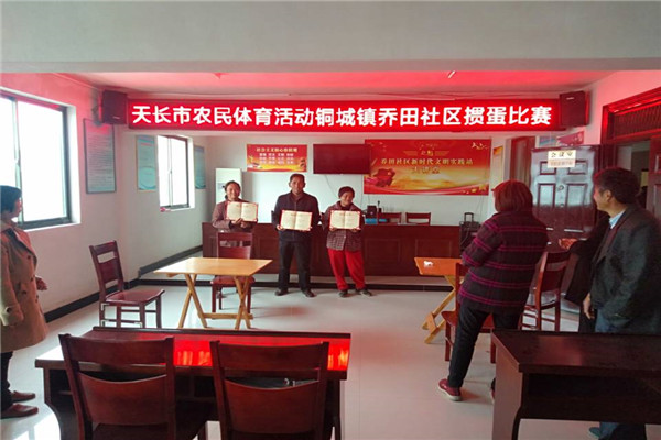 2020年11月19日为丰富群众业余生活,乔田社区组织社区居民举办农民体育贯蛋比赛活动,并对获奖者颁发证书以兹鼓励。