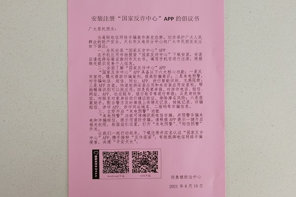 为遏制电信网络诈骗案件高发态势,切实保护广大人民群众的财产安全,施庄村村干全体行动,下队走访农户,协助村民了解、安装“国家反诈中心”APP,注册并实名认证“国家反诈中心APP”,携手接种“反诈疫苗”,有效抵御电信网络诈骗侵害,共建“平安天长”。