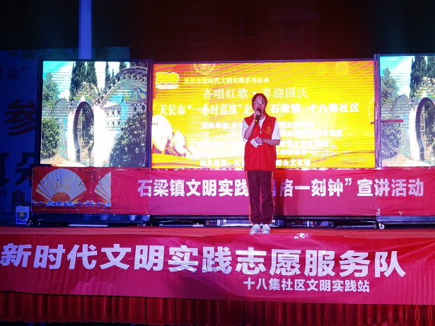 25日晚,石梁镇十八集社区居民广场开展新时代文明实践“一刻钟宣讲进社区”,结合党史学习教育,镇文明实践所文化志愿者仲露向社区居民作题为《忆峥嵘岁月 传革命薪火》的宣讲,声情并茂的宣讲,受到台下广大居民们阵阵热烈的掌声。