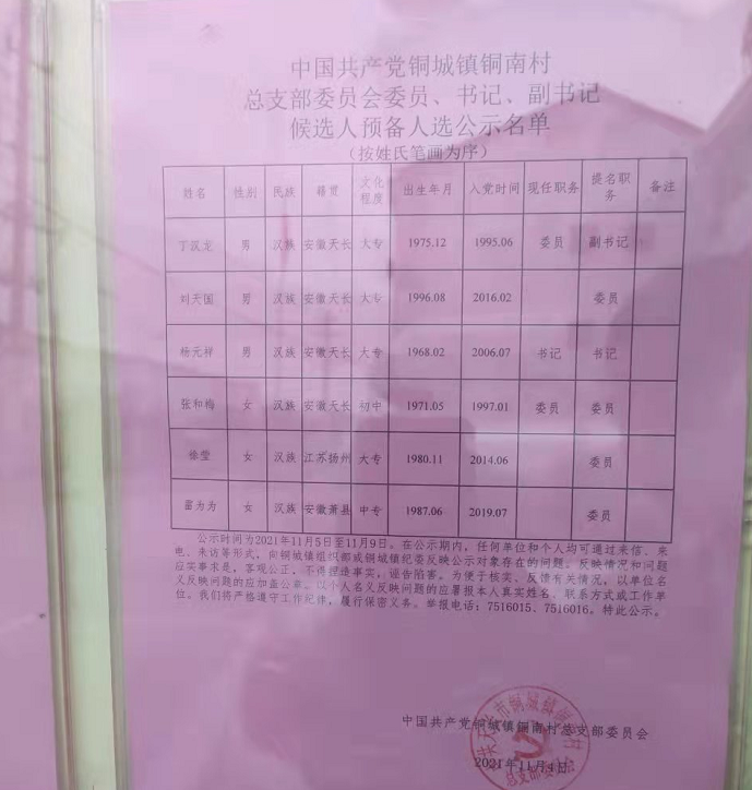 中国共产党铜城镇铜南村总支部委员会委员、书记、副书记候选人预备人选公示名单