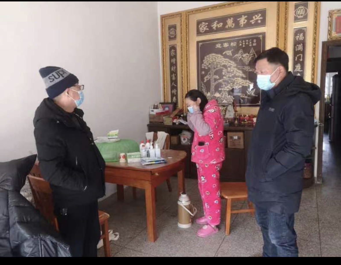 镇民政办章主任走访慰问联圩村监测户,并送来退烧药、消毒液、口罩等慰问品。