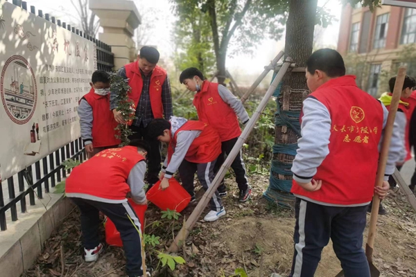 在党支部书记徐吴军和校长李琦的带领下,党员教师和少先队代表们在校园内栽下棵棵树苗,留下片片新绿,活动现场呈现出一派热火朝天的劳动场面。大家热情高涨,干劲十足,分工明确,有的挥锹挖土,有的填土扶苗,有的提桶浇水……三个一群,五个一组,互相协作,配合默契,个个忙得不亦乐乎。植树现场洋溢着劳动的热情,到处都是忙碌的身影和劳动的欢声笑语……在大家的共同努力下,一株株新栽下的植物展现着蓬勃生机,给校园增添了一道道亮丽的风景线。