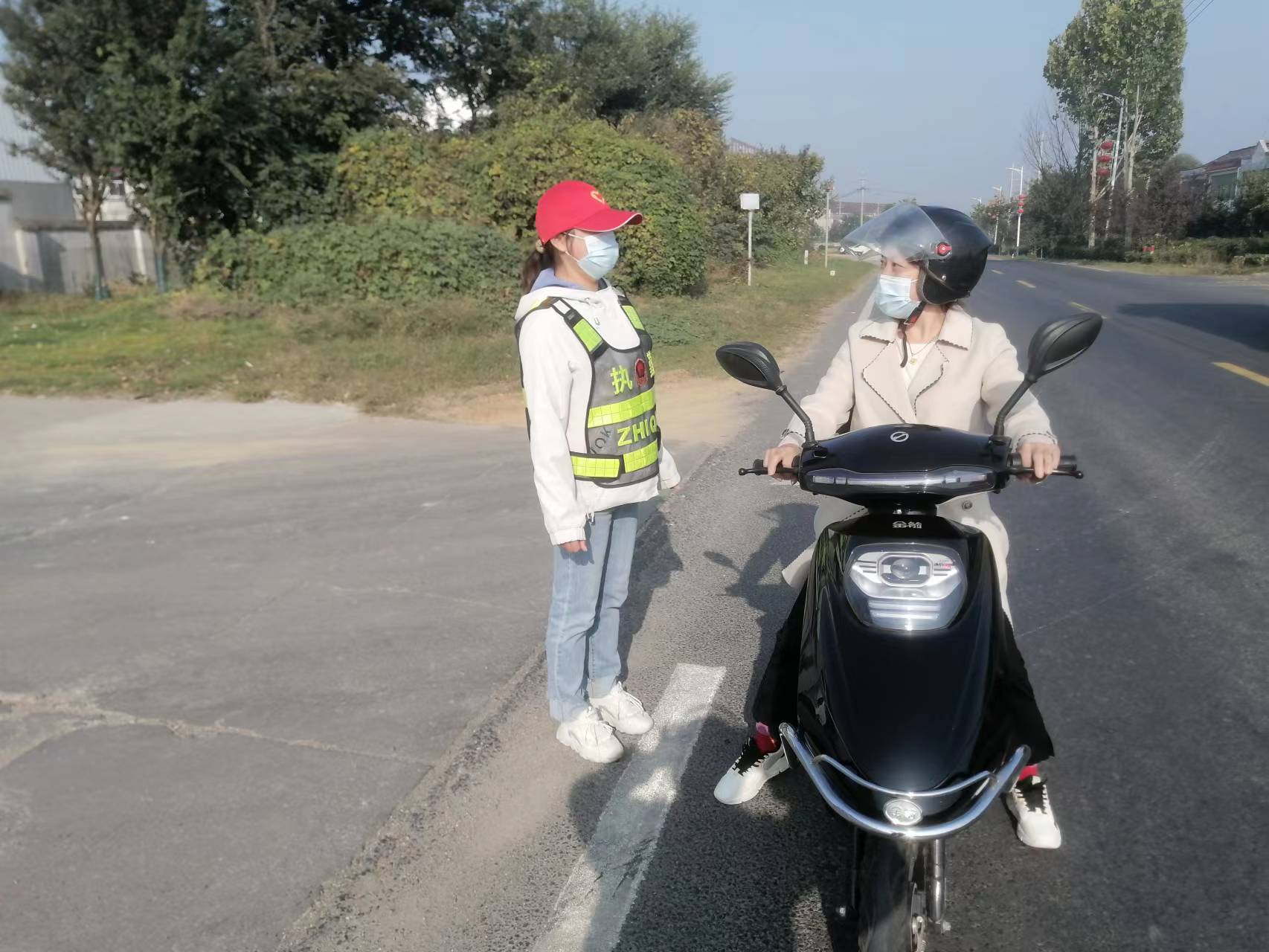 党员志愿者在辖区交通主干道、十字路口等重点路段开展交通安全劝导,对违法载人、不戴安全头盔、不系安全带等交通安全违法行为进行教育劝导,向驾乘人员普及道路交通安全法规,向有需要的村民宣传电动自行车保险,并提醒大家在行车过程中要注意交通安全。