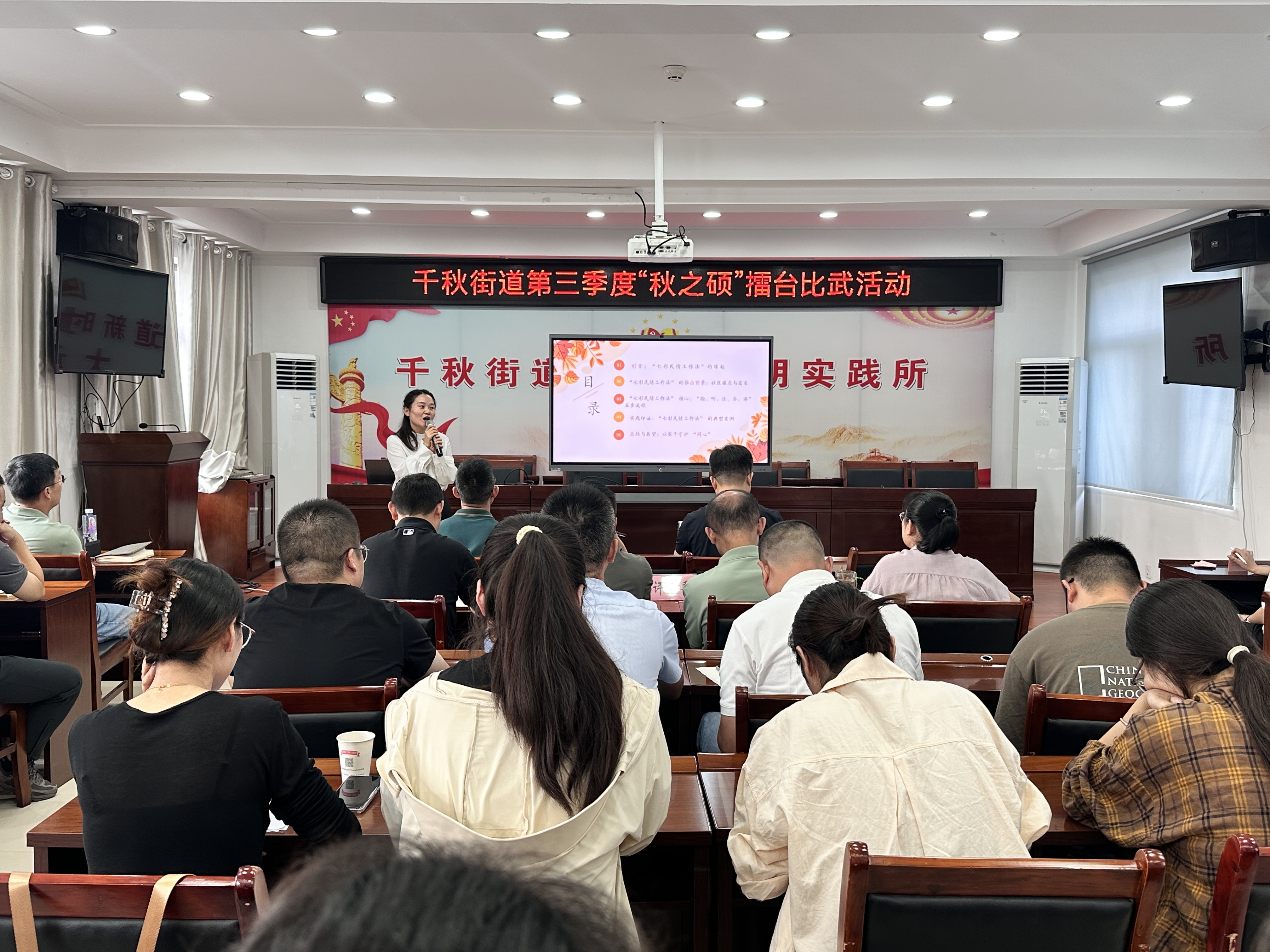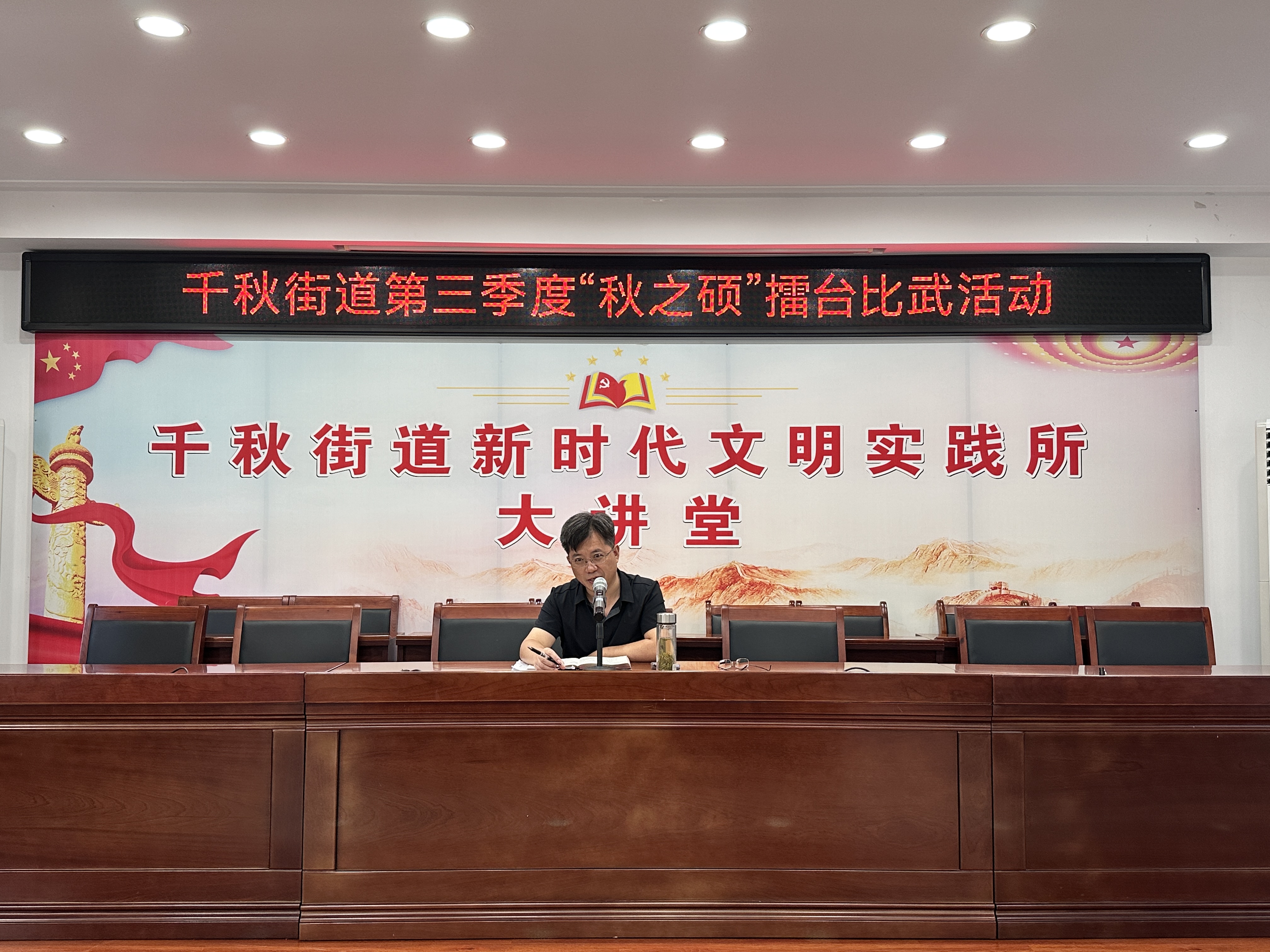 为深入推动居村副书记在实践磨砺中提升“能说会干、善作善成”的综合素养,持续营造“在比中学、在赛中干”的浓厚氛围,千秋街道聚焦“秋之硕”主题,举办三季度“擂台比武夺旗争先”活动。12名副书记轮番登台,围绕基层治理、民生服务、队伍建设等重点工作,“说”矛盾破解之法、“晒”实干攻坚之果、“亮”创新发展之策,上演了一场直击问题、干货充盈的“履职大考”。