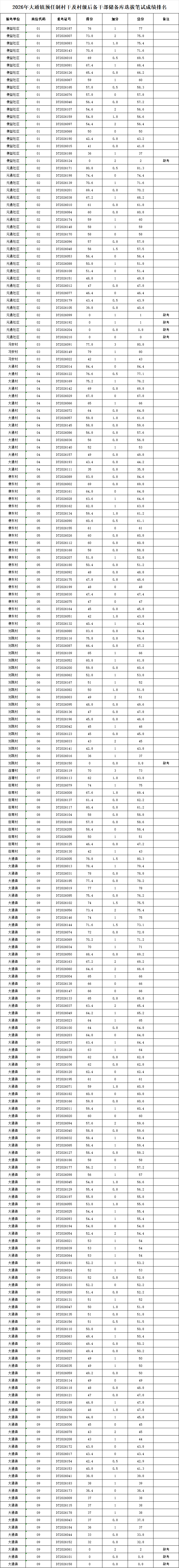 2026年大通镇预任制村干及村级后备干部储备库选拔笔试工作已结束,现将笔试成绩排名予以公布。