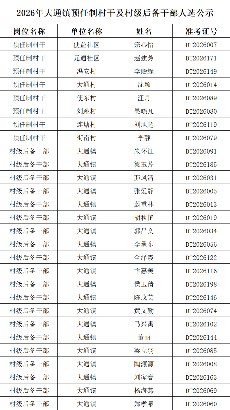经前期笔试、资格复审、面试、考察等一系列环节,现将2026年大通镇预任制村干及村级后备干部储备库的人选进行公布。