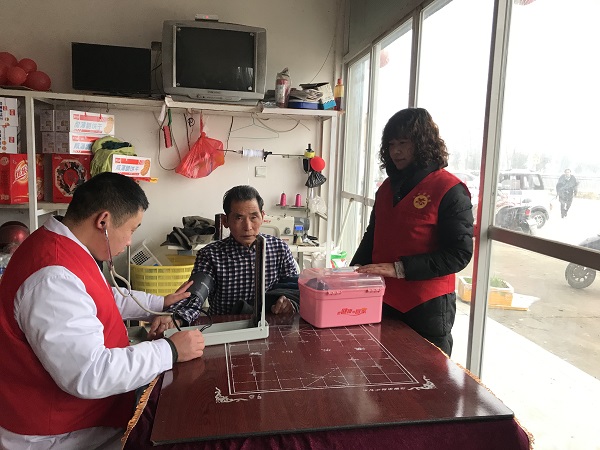 他们来到宏大村留守老人丁福春家里,为他们夫妻做简单的身体检查:量身高、测体重、量血压、测血糖等。在与留守老人交谈,嘘寒问暖之后为他们送上“把健康带回家”多功能家庭医药箱,医药箱能储存家庭常用药品、药具。留守老人一般年纪偏大,或多或少患有几种慢性疾病,每天需要服用好几种药品,加之留守老人记性差,经常找不到药品或者混淆了药品。有了家庭医药箱,他们可以把按类别把药品存储在封闭式医药箱里,既方便又安全。