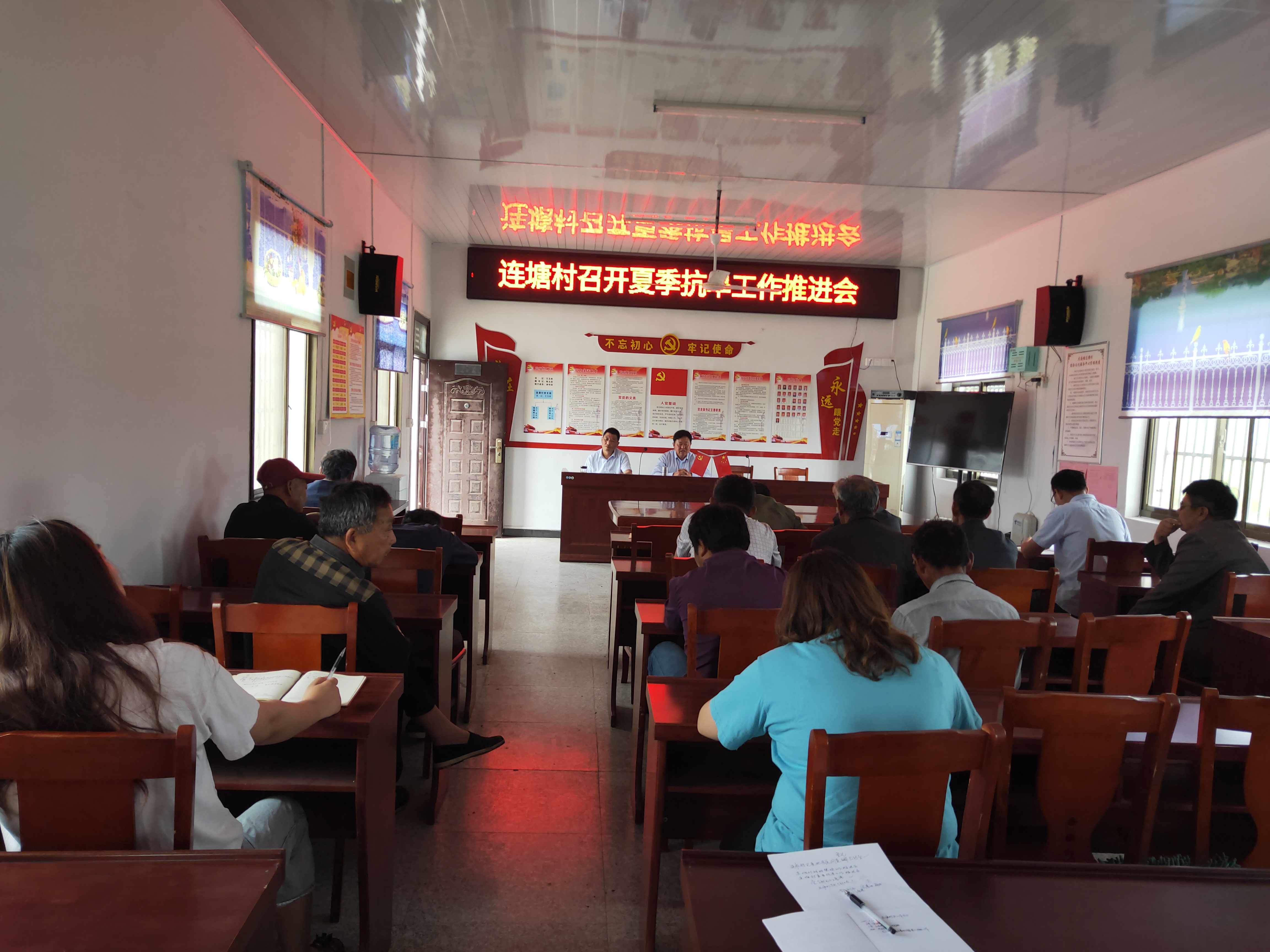 同时,召开村队夏季抗旱工作会议。会议上各村民组长汇报了各组截止目前的种植和用水情况,以及下一步工作计划。全体人员对当前旱情进行深入分析、研究,就电灌站正常供水、村队塘坝备水、农田补水等抗旱准备工作拿出了具体的方案,为连塘村的农业生产奠定了基础。