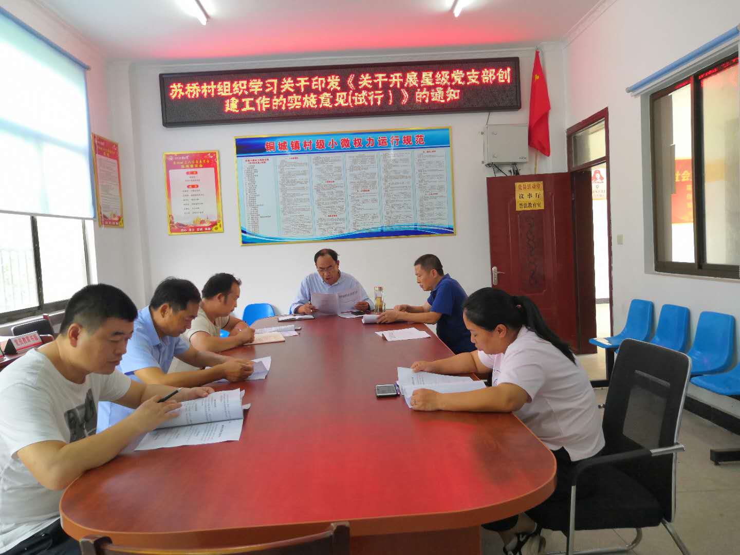 2020年9月2日上午,苏桥村两委组织学习上级关于印发《关于开展星级党支部创建工作的实施意见(实行)》的通知。文件明确了目标任务、制定创新标准、规范评星程序、强化结果运用和压实工作责任,根据《中国共产党章程》 《中国共产党支部工作条例(试行)》及《安徽省农村基层党组织建设标准(试行)》等,制定农村星级基本标准。