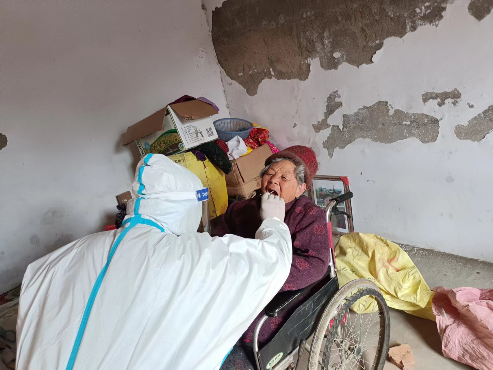 保安村工作人员和核酸检测医务人员每到一户老年人家中,先进行信息登记,再消毒进行咽喉取样。