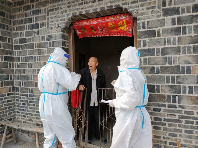 每到一户村民家中,村干部都会与老人亲切交流,耐心询问他们的日常生活情况与身体状况。随后,医护人员为老人开展咽拭子样本采集工作,打开采样箱,消毒,采样,再次消毒…,每一个环节都认真操作,心无旁骛,在老人的主动配合下,采样工作有条不紊地顺利开展完成,采样完成后医护人员还不忘叮嘱老人要做好日常防护和室内消毒。村干部和医护人员把核酸检测服务送到家,打通了防“疫”最后一公里,赢得了村民的支持与赞叹。