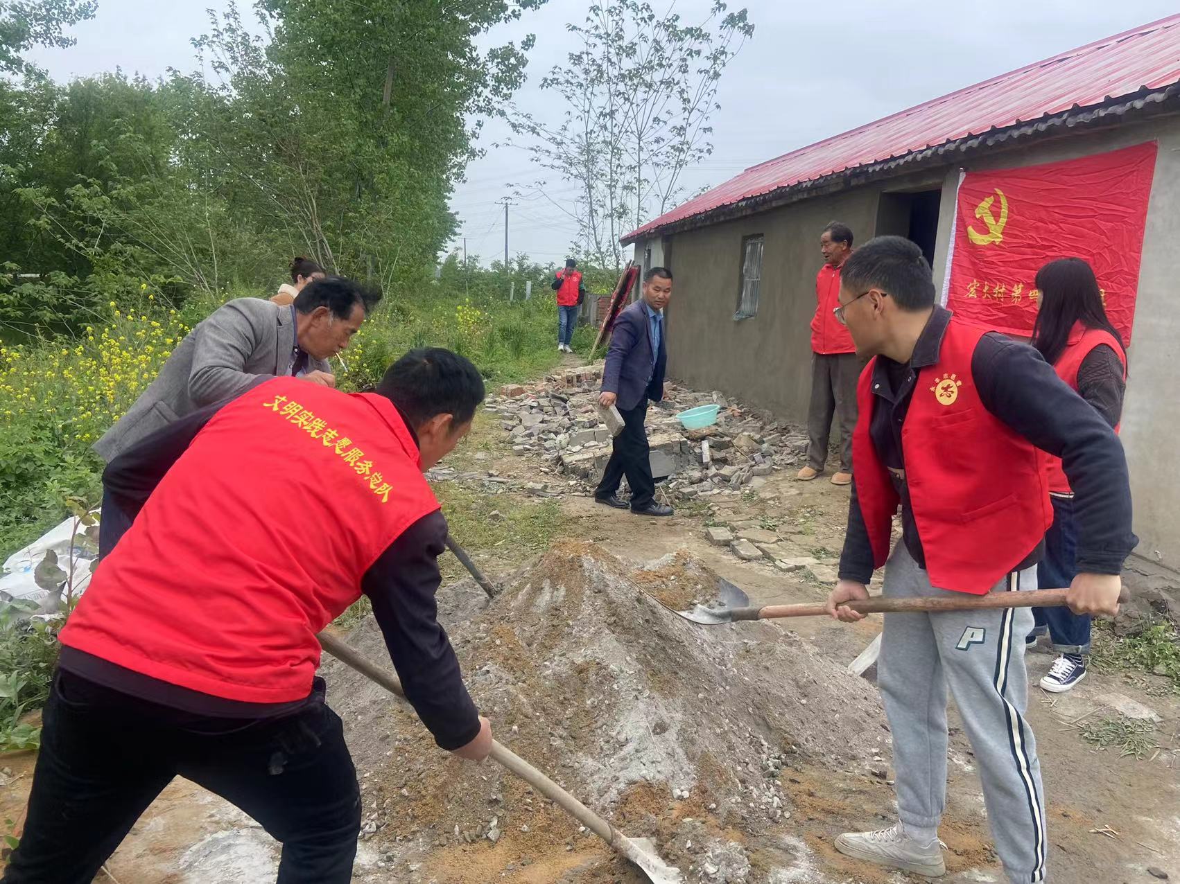 5月4日上午,部分党员、群众志愿者一行10人浩浩荡荡的来到了宏大村马庄组老党员马兆明家,帮助其整修濒临倒塌的房屋。活动现场,他们身着红马甲,有人砌墙、有人搬砖、有人提水、有人搅拌水泥……一件件、一桩桩工作都在有条不紊地进行着,虽然辛苦、虽然流汗,但大家还是忙得热火朝天的,没有一丝怨言和抱怨,以实际行动,充分践行了“奉献、友爱、互助、进步”的志愿者精神。