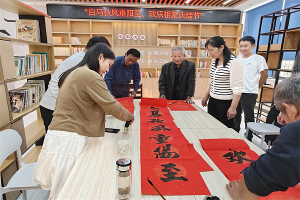 在白马村,巾帼志愿者开展了“白马秋风重阳至,欢乐相聚庆佳节”活动,邀请村里的老人参与书法文化交流。活动现场,老人们以书法为媒介,将祝福融入笔墨之中,寄语重阳节。浓浓的墨香在空气中氤氲,书香味十足。在联盟村,巾帼志愿者们开展了“金秋重阳,相伴暖心”茶话会。茶话会邀请了村里的孤寡、独居、空巢老人,老人们围坐在一起,一边品尝着水果和糕点,一边闲话家常,洋溢着节日的欢乐气氛。同时,各村的巾帼志愿者带着礼物前往老年人的家中进行慰问,帮助老人打扫卫生,为老人们剪头发,与他们话家常,倾听他们的心声,让他们在这个传统节日里感受浓浓的关爱和温暖。