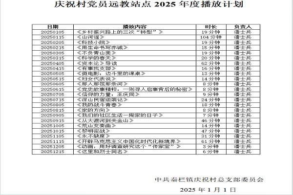 上一篇:秦栏镇庆祝村:党员远教站点2024年12月播放计划[ 12-01 ] 下一篇:秦栏镇庆祝村:党员远教站点2025年1月播放计划[ 01-01 ]
